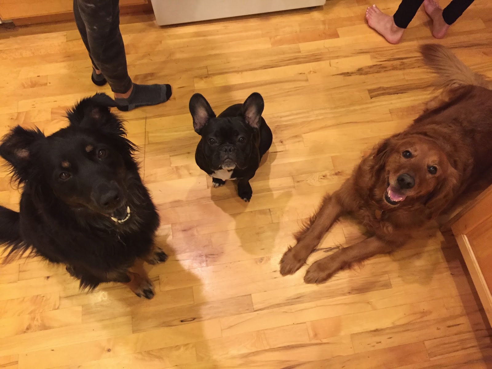 My parents watch Thor quite a bit for us since we are still in school and are gone a lot. Brandon's families dog Jenny has been staying over with them too and my uncle Greg's dog Zooey. Thor loves going over there to see his buddies. My dad grabbed the cheese out of the fridge one night and this is what the dogs did...just stared at him hoping to get a slice. Thor kills me!