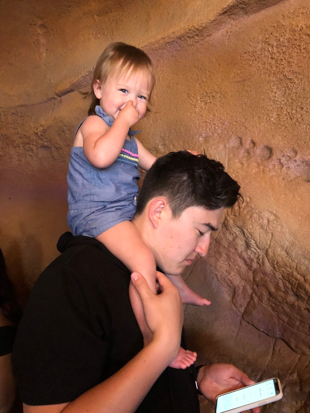 We had a fast pass to meet Cinderella at 4:30 but the girls were so tired and ready to nap. The line said it was 20 minutes long and it was 3:30 so I decided to just wait in line and see her real quick. The line ended up taking over an hour! We got to go in around 4:40. I was pretty annoyed at that point but our girls ended up both napping the entire time. Eleanor on my back and Harper outside with Brandon which made them ready to take on the rest of the day and we stayed til dark.